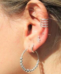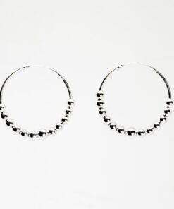 Los pendientes ARAN (12mm) son aros tipo bali hechos con Plata de Ley 925. Tienen una bolita central, acompañada de una decoración con trazos diferenciados alrededor y un entramado de oscilaciones.