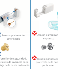 - Cápsulas de perforación estériles. Es importante mantener la zona limpia antes y durante el piercing para evitar irritaciones. El sistema Inverness utiliza cápsulas perforadoras totalmente cerradas y esterilizadas para evitar la exposición a contaminantes bacterianos.
