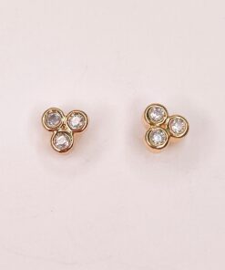 Mini par de aros con tres circones, simulando la forma de un trébol. Ideal para acompañar otros aritos, argollas o simplemente usarlo solo. Es un básico que no puede faltar en tu joyero.